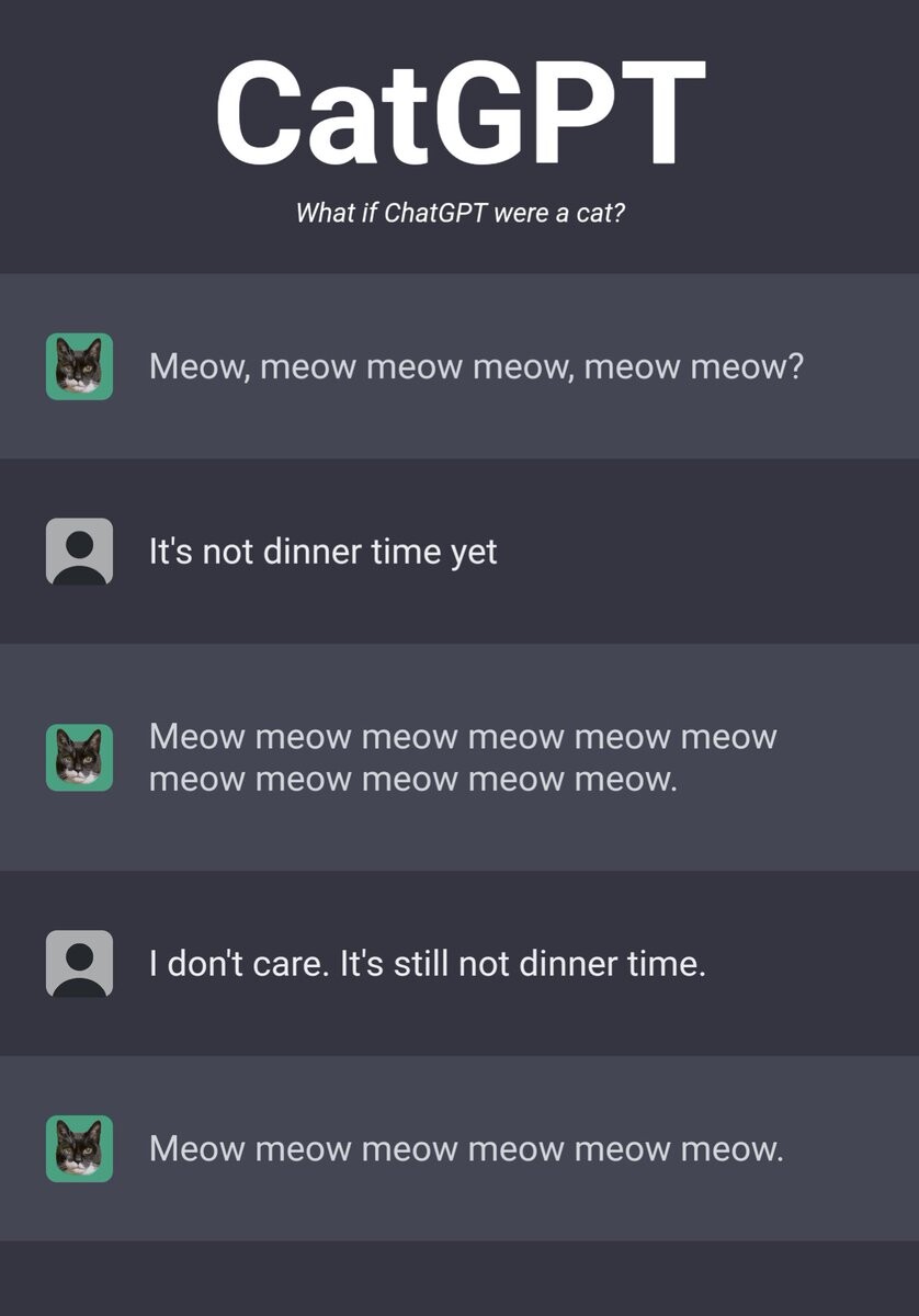 I have to say, CatGPT is scarily accurate. Machine learning has come a long way.